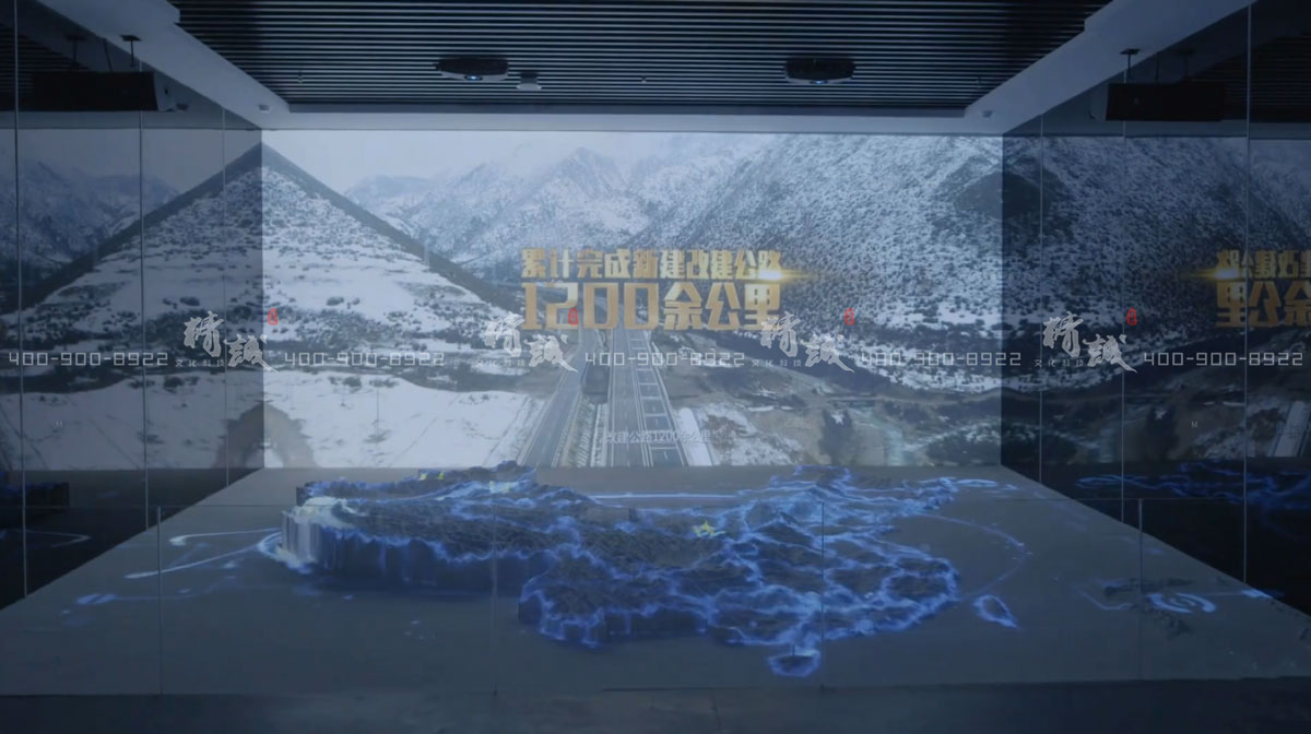 通過沙盤模型、電子地圖、大數(shù)據(jù)平臺、沉浸式數(shù)字沙盤等綜合展示中鐵北京工程局一公司在鐵路工程、公路工程、城軌工程、房建工程、市政工程方面取得的輝煌成果。沉浸式數(shù)字沙盤,通過投影畫面覆蓋物理模型的形式,實現(xiàn)沙盤和主畫面完整立體的視覺效果。
