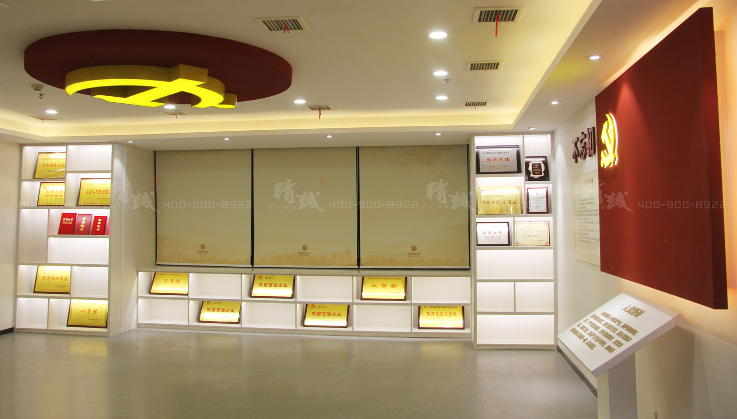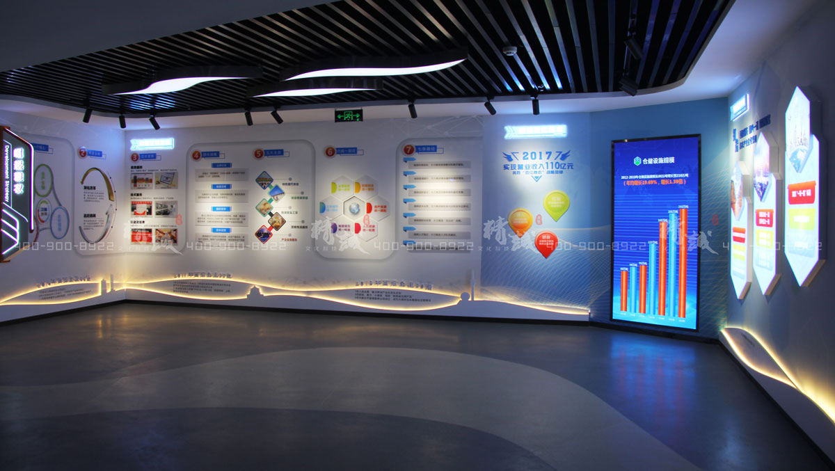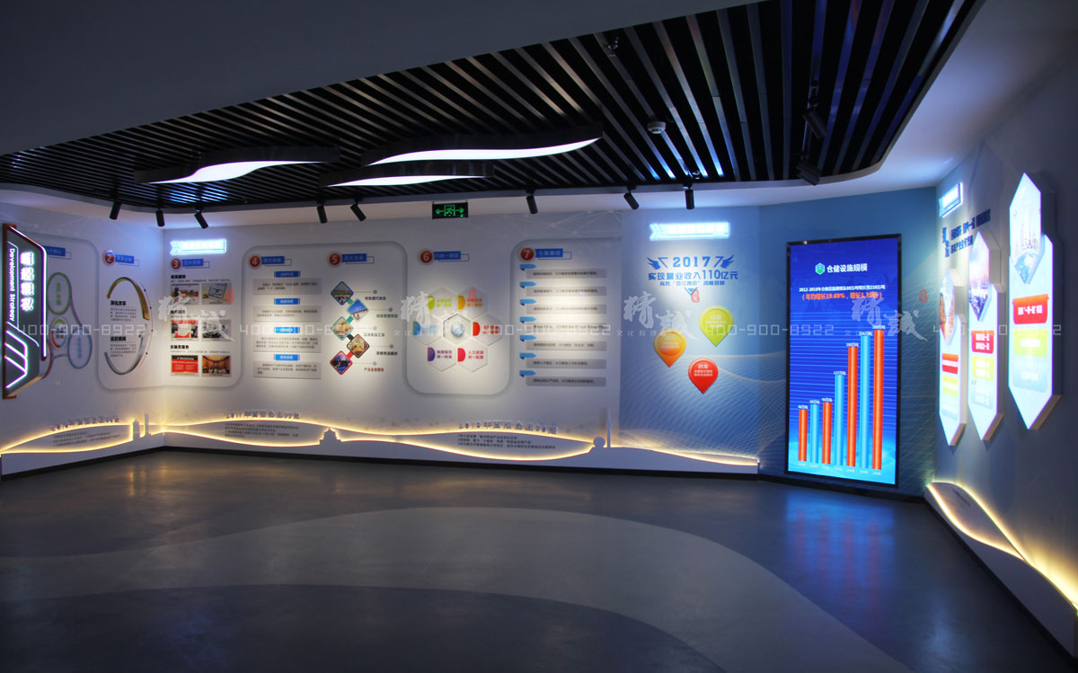 該板塊采用墻面圖文展板+多媒體顯示屏,并結合細節化背發光式場景墻面裝飾,以頂墻地三面結合的畫面形式,對集團的發展、榮譽進行展示,達到視覺的豐富感和連貫性。