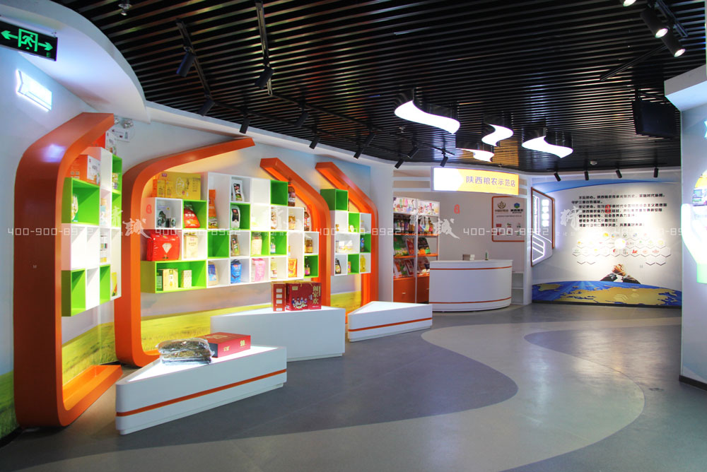 糧倉造型,獨具匠心的產品展架設計,陳列糧農產品,配合展示糧農集團服務體系。微縮示范店,線上體驗,線下銷售的體驗,及實體售貨柜陳列。
