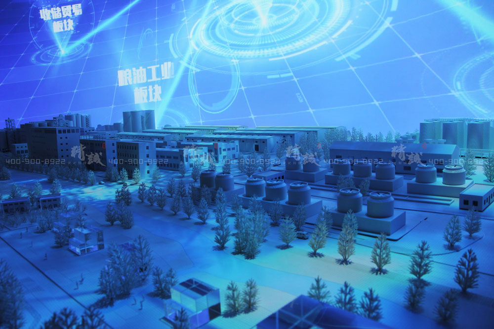 利用數字投影升級沙盤,配合弧幕投影,以聲光電聯動的效果播放糧農集團宣傳片,給觀者以強烈的視覺震撼。