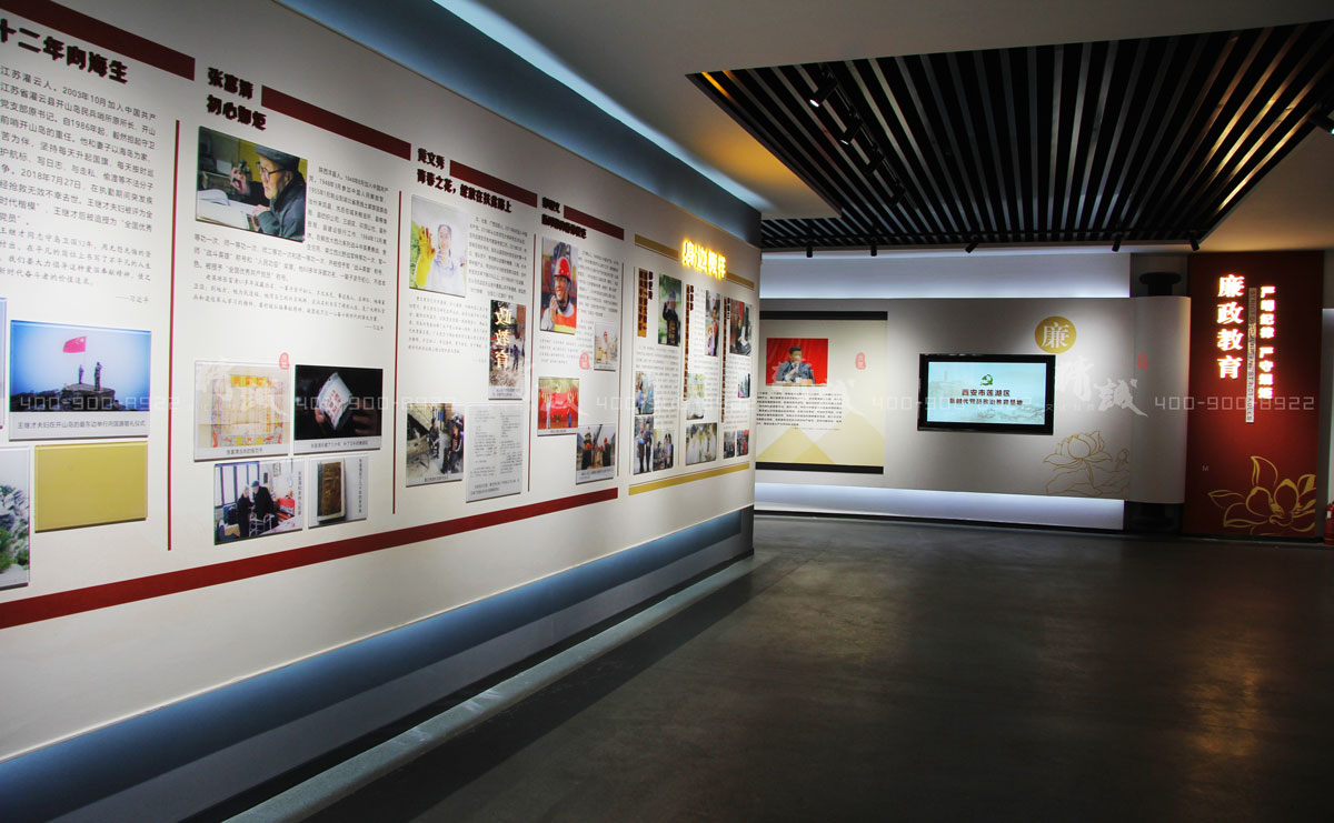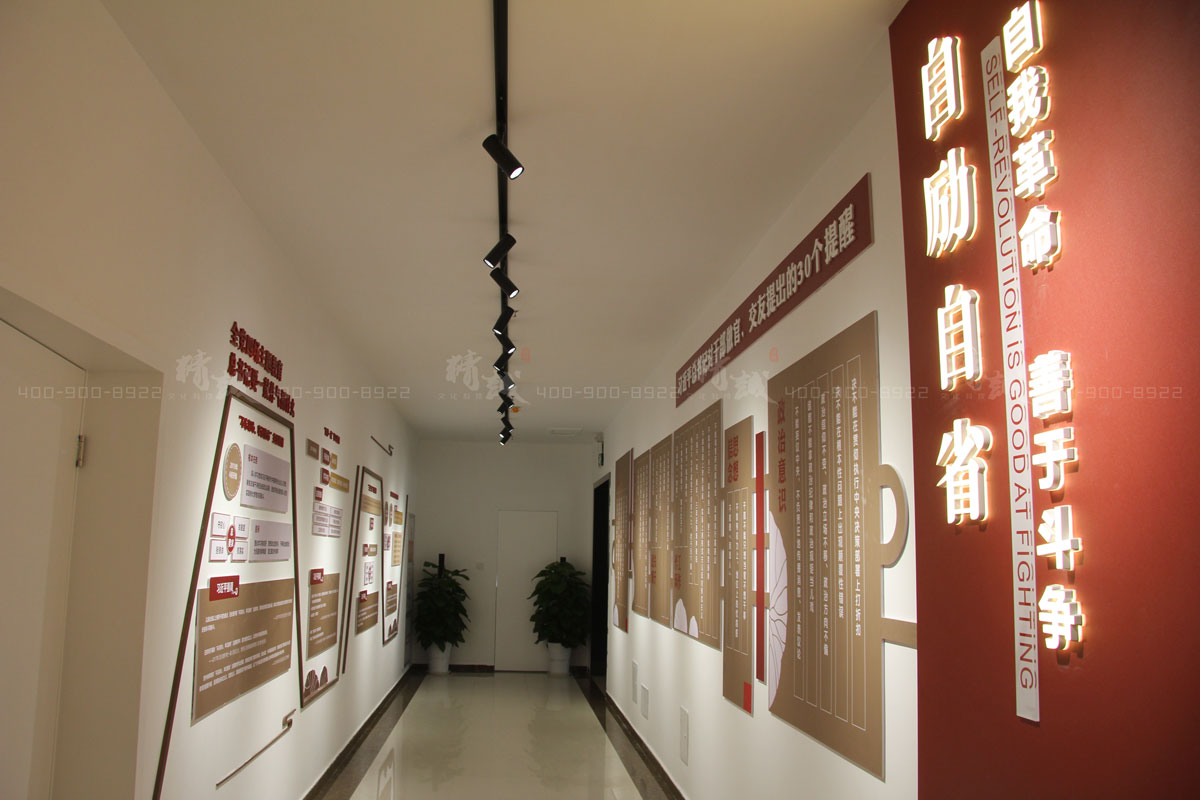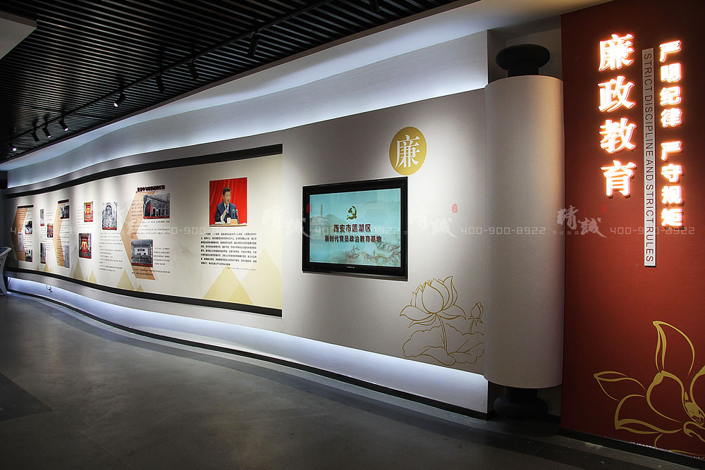 配合廉政警示教育,采用鐵絲網造型墻和吊頂警鐘設計,展示中央紀檢監察機構歷史沿革、蓮湖紀檢監察機構歷史沿革以及十八大以來中省市區反面典型案例,從視覺感官層面引導廣大黨員干部自警自省,自重自律。