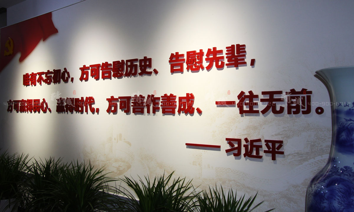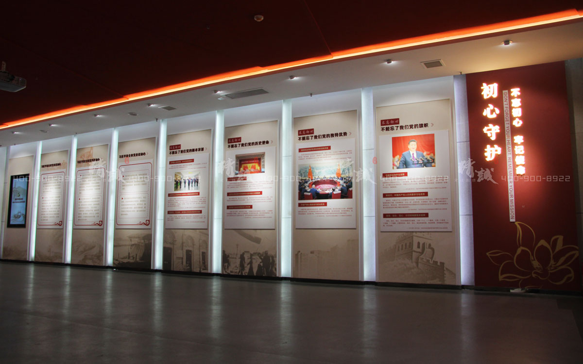 初心守護廳以“不忘初心、牢記使命”為主題。進入展廳,莊嚴的黨旗和醒目的入黨誓詞令人肅然,吊頂采用大面積紅色內嵌發光燈帶寓意黨的光輝萬丈,兩側墻面展板展示習近平總書記關于初心的重點論述,黨旗處設置投影屏,播放黨性教育影片。這一板塊將靜態畫面的“初心”論述與動態教育的影片相輔設置,能夠調動黨員干部們的學習熱情、加深黨員干部對“初心”的理解。