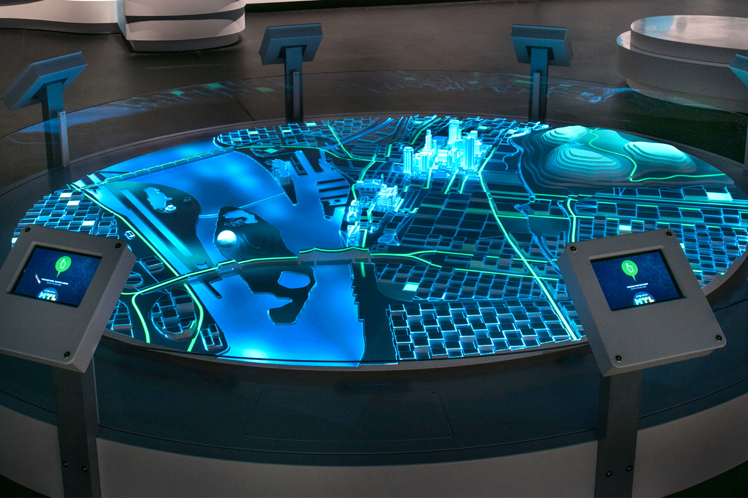 數(shù)字沙盤(pán)早已突破“只觀看"層面上的限制,通過(guò)三維影像與交互設(shè)計(jì),可融入互動(dòng)功能,不管是通過(guò)點(diǎn)擊查詢(xún)更詳細(xì)的信息內(nèi)容,還是通過(guò)人體動(dòng)作設(shè)定展示特定圖像與參觀者產(chǎn)生互動(dòng),增加其趣味性。