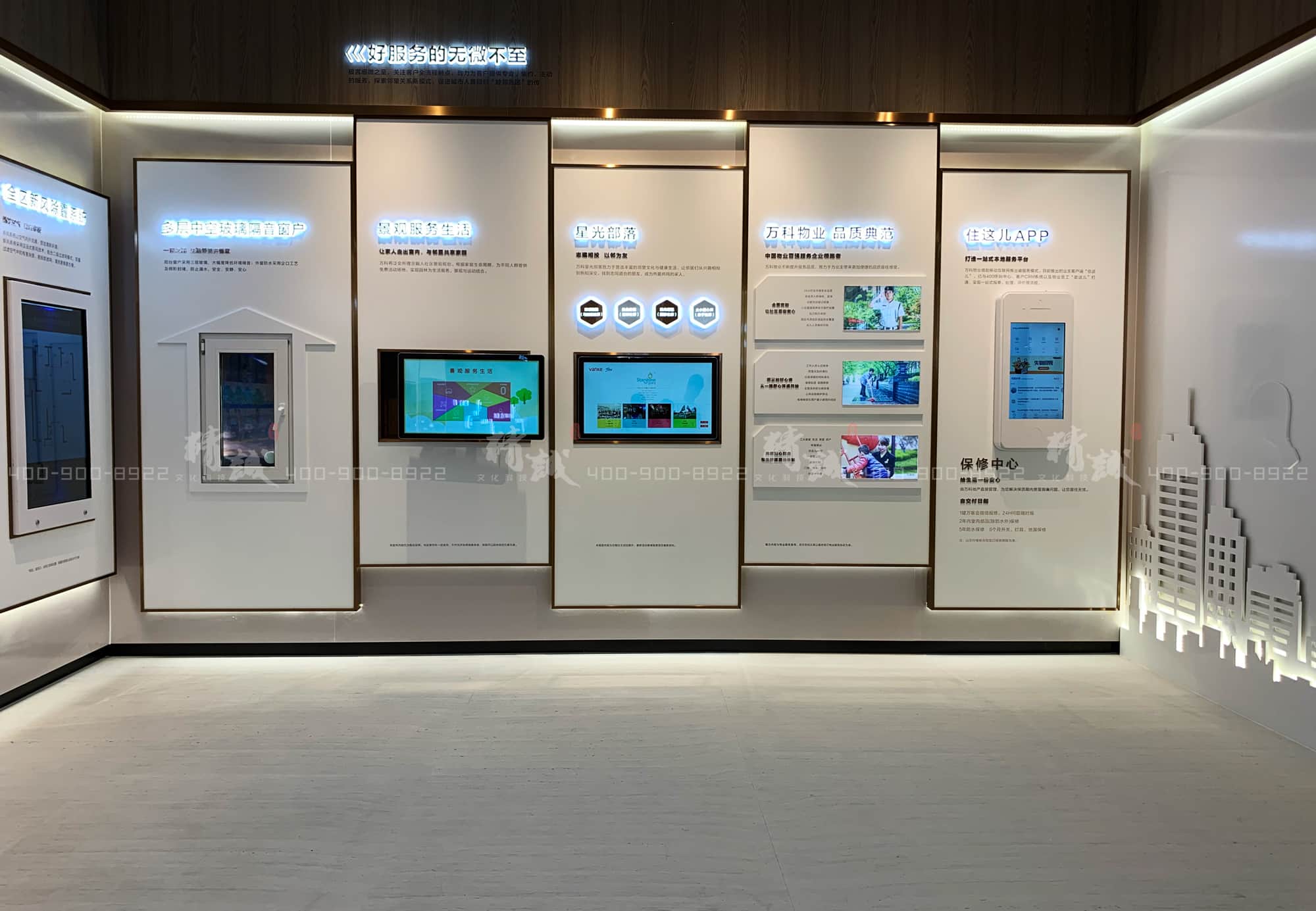 細(xì)微知著,墻面展板展現(xiàn)了萬(wàn)科為業(yè)主提供無(wú)微不至的好服務(wù):有友好和諧的鄰里活動(dòng),有全國(guó)百?gòu)?qiáng)的物業(yè)為業(yè)主提供便捷的高品質(zhì)居住生活,更有業(yè)主專屬客戶端——“住這兒APP”為各位業(yè)主提供一站式的本地服務(wù)。