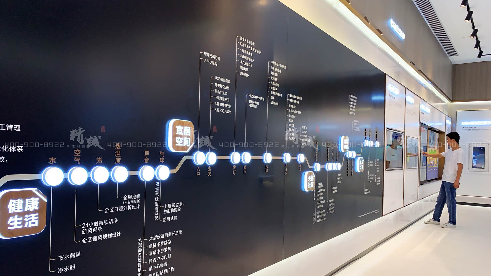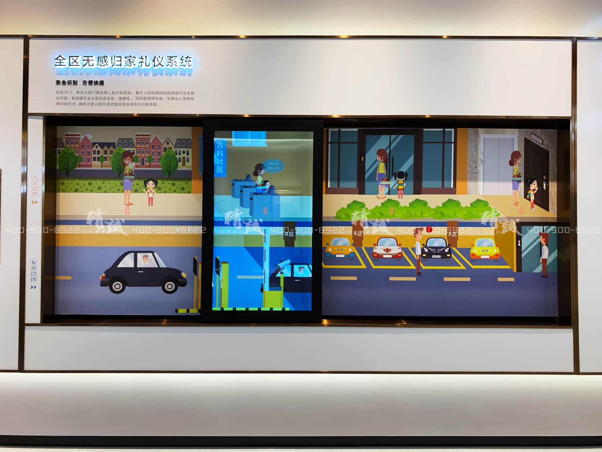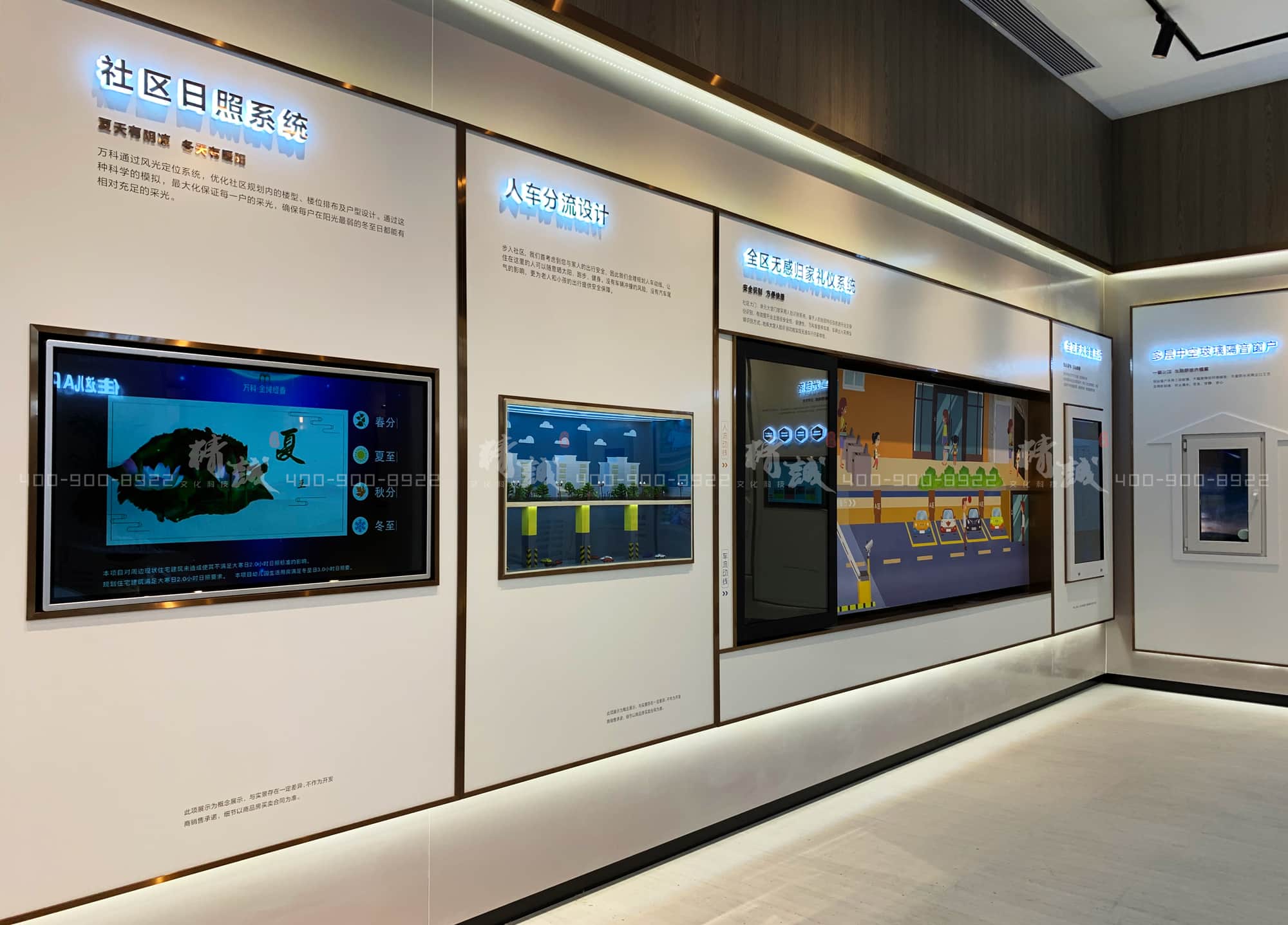 從觸摸屏的社區(qū)日照系統(tǒng)展示,到人車分流的微縮場(chǎng)景,再到互動(dòng)滑軌屏展示的全區(qū)無(wú)感歸家禮儀系統(tǒng)。