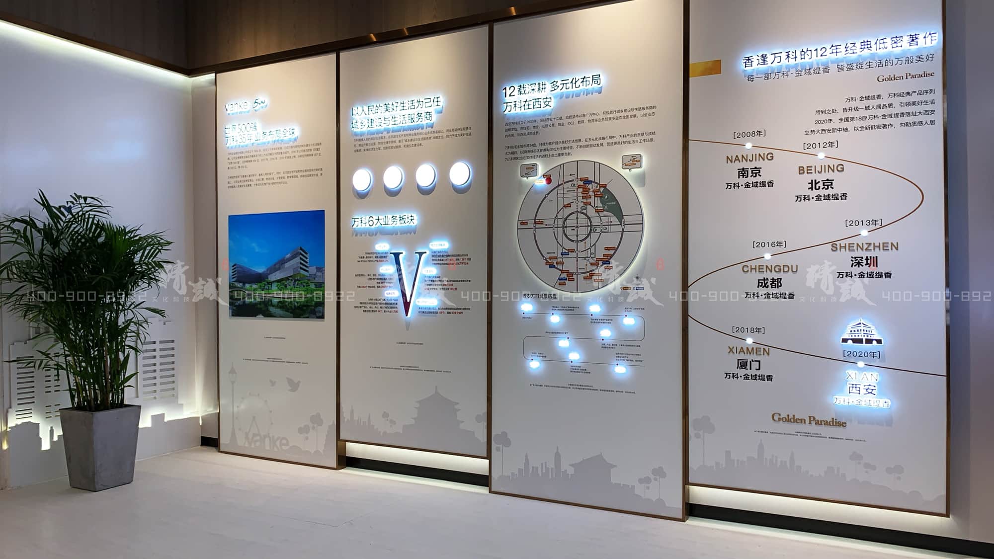 十二載深耕布局,十二年經(jīng)典著作,墻面的四幅展板記錄著萬(wàn)科在西安發(fā)展的每一個(gè)歷程。