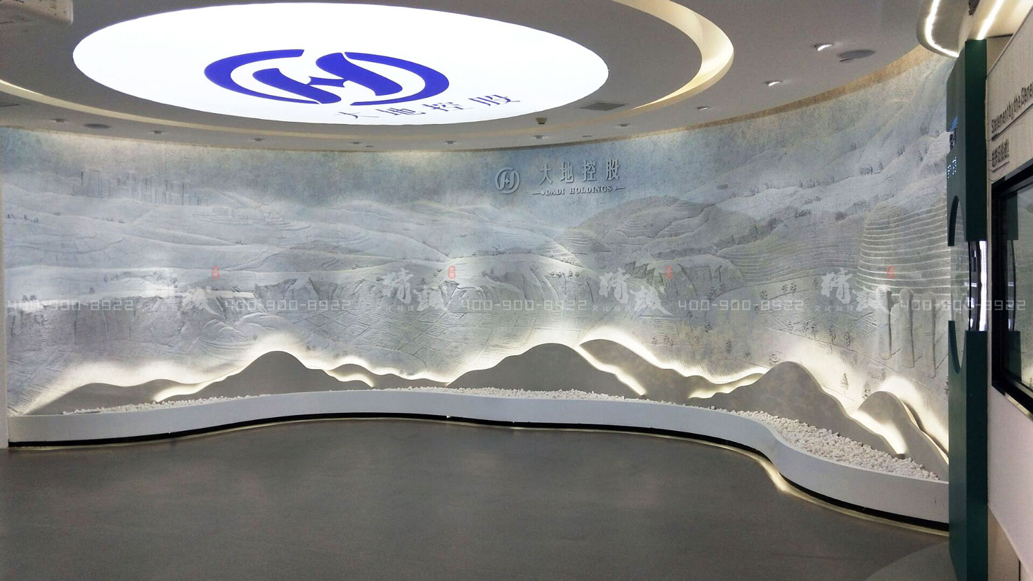 穿過前廳,我們便進(jìn)入序廳部分,弧形的“綠水青山”浮雕墻氣勢雄渾,描繪著大美河山、和諧的生態(tài)自然環(huán)境,在結(jié)構(gòu)投影光電效果的加持下,浮雕畫面上投射的動(dòng)態(tài)影片,講述著人類生產(chǎn)生活對土地環(huán)境的破壞日益加劇,以改善自然環(huán)境為己任的大地集團(tuán)應(yīng)運(yùn)而生。