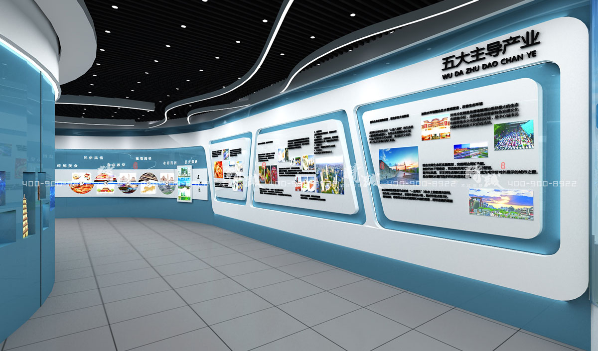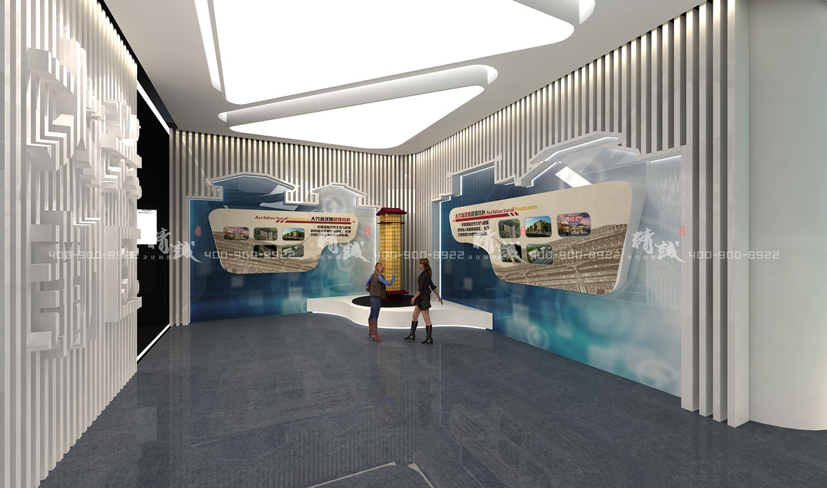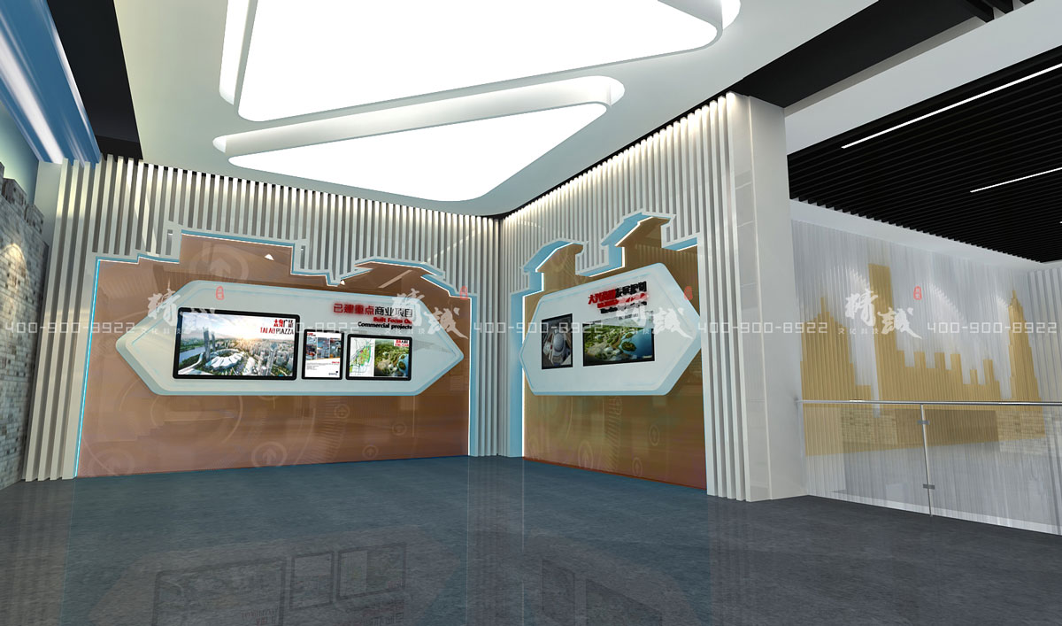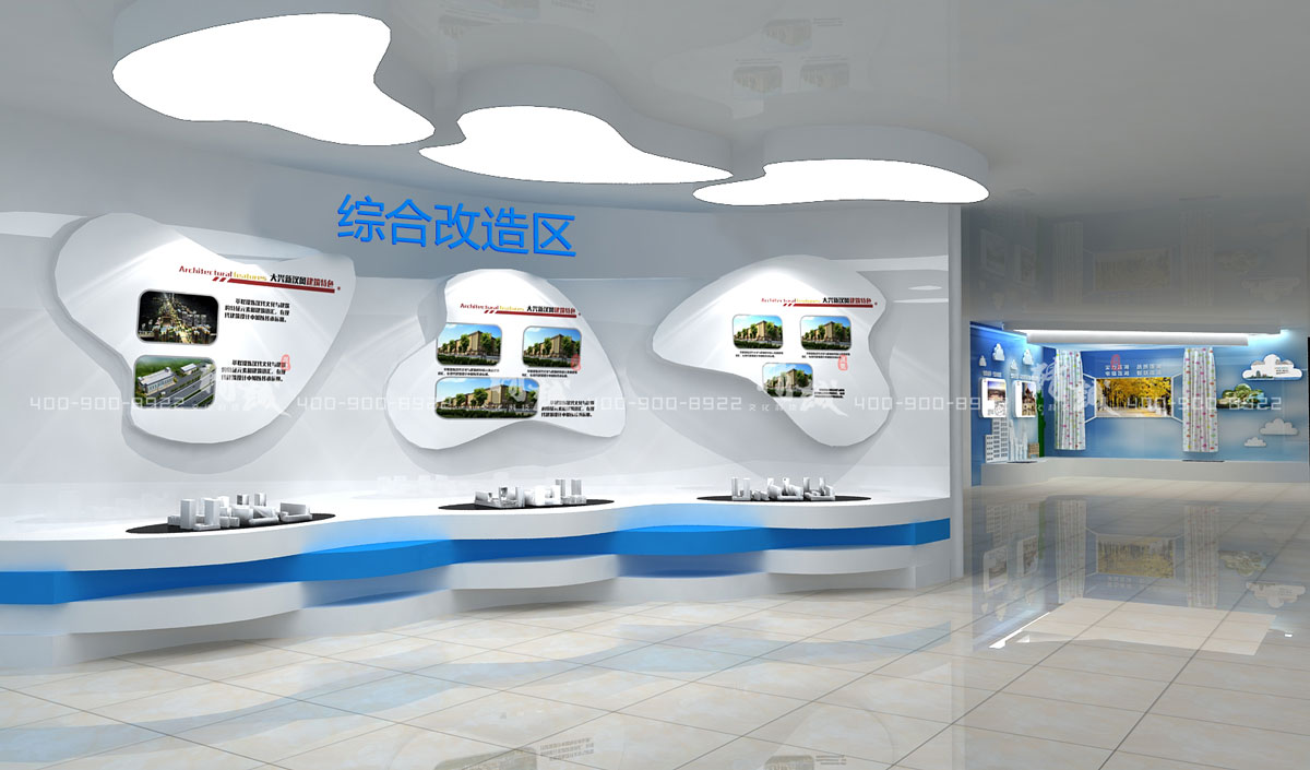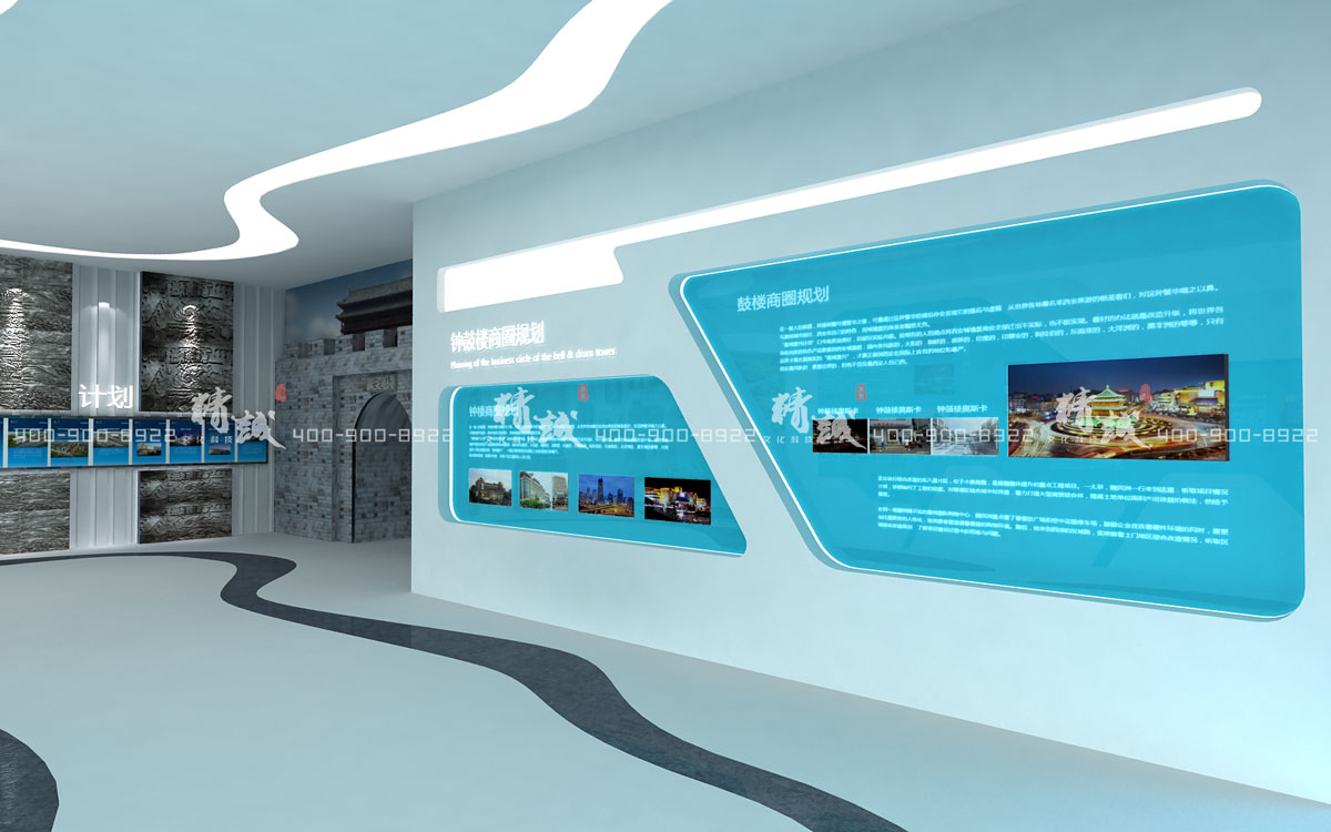 展覽館設計采用現代時尚的元素來設計,運用白、藍、灰三色妝點形成空間氛圍,通過色調和墻面及立體空間設計的合理搭配,展示蓮湖形象形象、雄厚實力、創新科技、生態環保的美好發展前景。