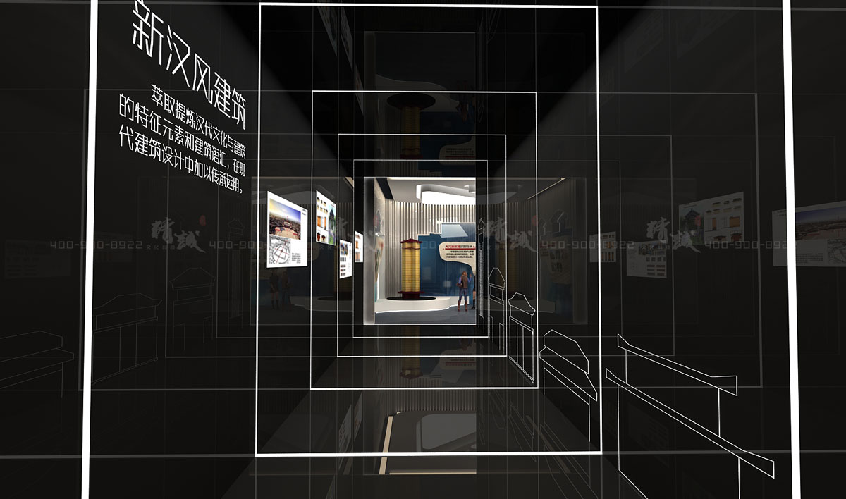 隧道用黑鏡和白色燈帶裝飾,利用鏡面本來的反射形成深邃的空間感,隧道左側墻面是漢風建筑的歷史演變,右側為漢風建筑線條裝飾。