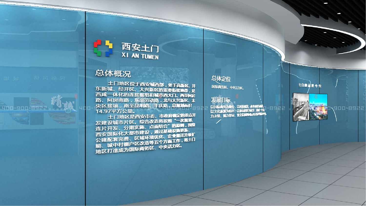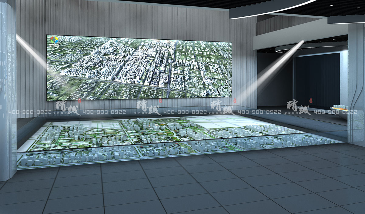 在原有總規沙盤的基礎上加上搖頭燈,配合原有多媒體系統展示土門的總體規劃、土門商圈發展規劃(產業布局,商貿發展規劃)。