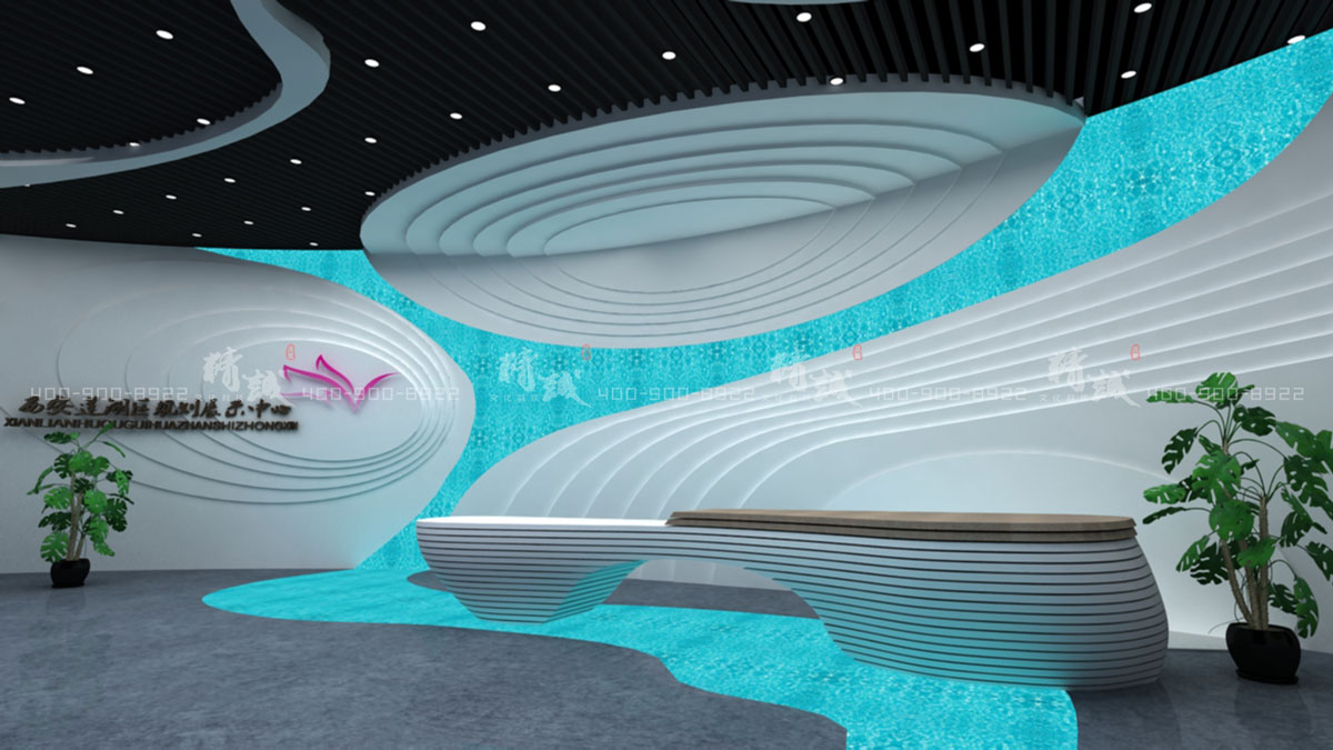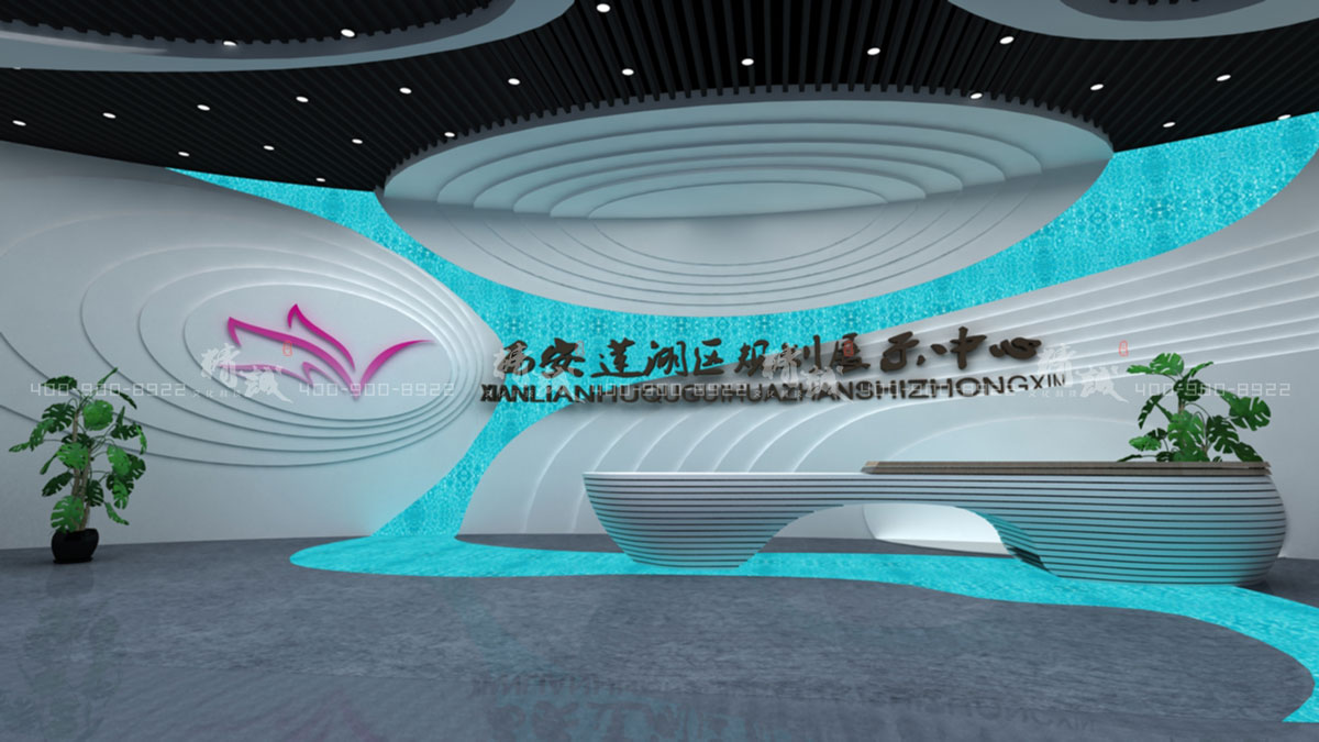 蓮湖,蓮花、湖水,我們通過蓮湖區字面含義提取出水滴漣漪的概念來設計形象墻,墻面的漣漪延伸入頂部,藍色的動態“湖水”從墻面蜿蜒流出到地面,形成墻、頂、地渾然一體的設計風格,視覺素雅、動感,符合展覽館主題。