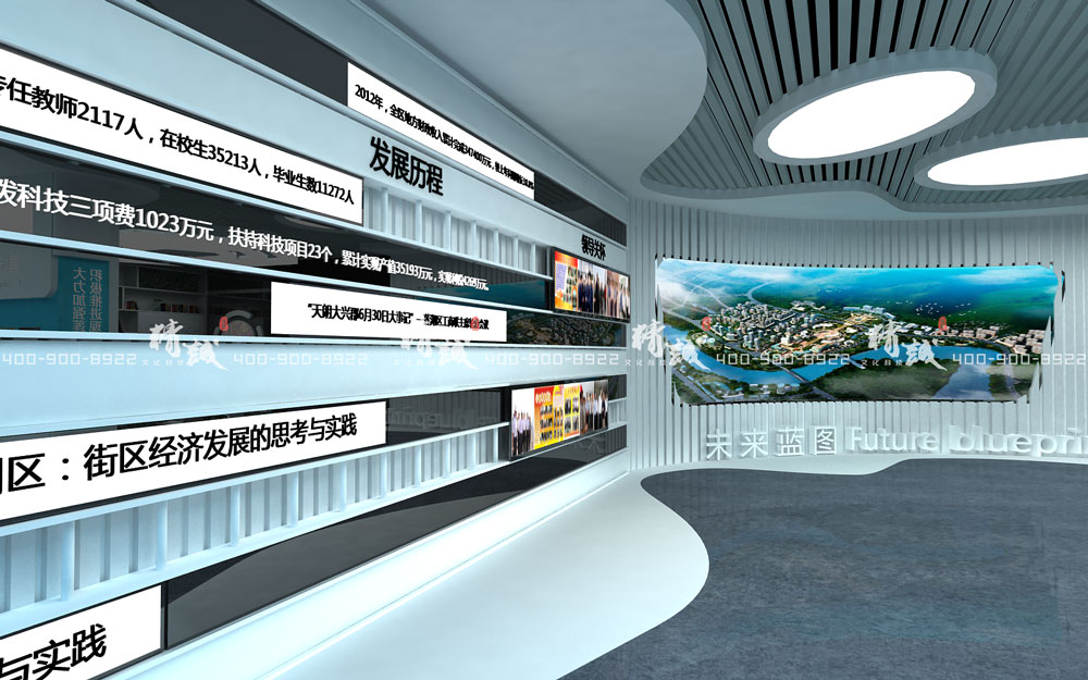 用建筑上常用的“工字鋼”造型來展示發展歷程和領導關懷板塊,在現代化的展陳設計中融入建設的概念,形成不斷發展的內涵,.后,通過視頻專題作為展廳結尾,描繪未來蓮湖發展藍圖。