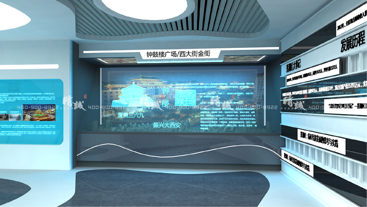 通過幻影成像技術展示鐘鼓樓廣場和西大街影像畫卷,動態的行人和車流,結合逼真的街區建筑,打造一副生機勃勃的繁華景象。