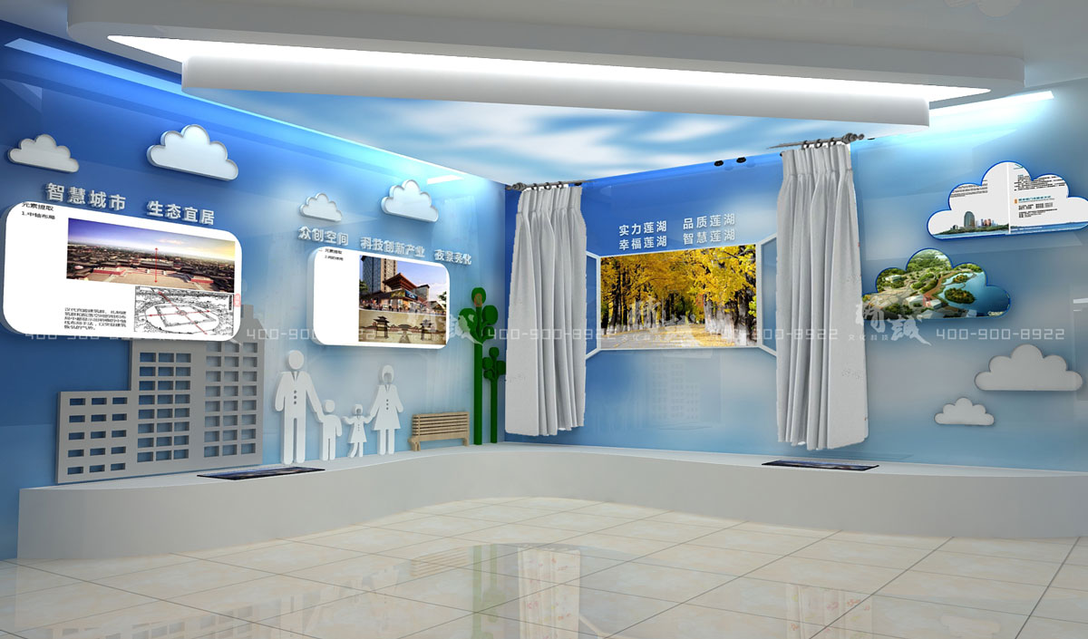 用云朵的墻面造型展示云端智能、智慧城市概念,通過自動窗簾和顯示屏展示“窗外”春夏秋冬優美環境,利用觸摸屏和落地查詢機展示眾創空間、科技創新產業和夜景亮化工程。