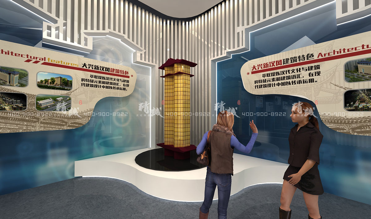 展墻用不同風格的漢風建筑剪影烘托環境,下方設置實體大興新區特色樓體模型,樓梯內發光,下方加入旋轉地臺360度旋轉,全方位立體化展示建筑特色。
