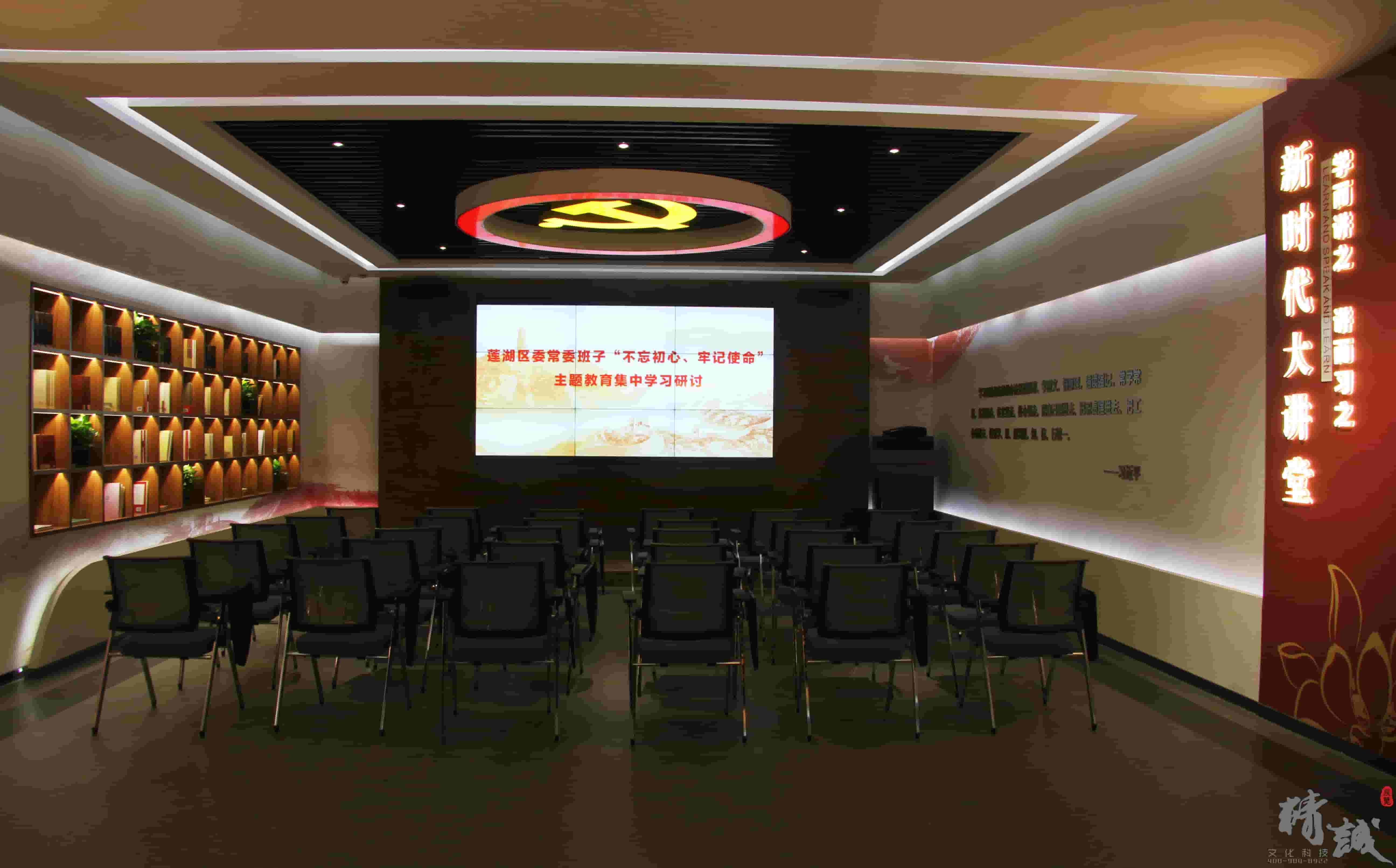 以“學而講之、講而習之”為主題,作為黨員干部開展新時代中國特色社會主義思想學習的陣地,黨員學習之后,在此開展自評、互評,亦可以邀請書記、專家、黨代表授課。此空間設置講臺、座椅及用于授課的拼接大屏,吊頂采用巨型黨徽,簡約又不失大氣。左側墻壁內嵌式書架擺放黨建讀物,黨員干部可自行閱覽學習,右側墻壁摘錄中國共產黨黨員教育管理條例內容,和大講堂黨員教育性質相呼應。