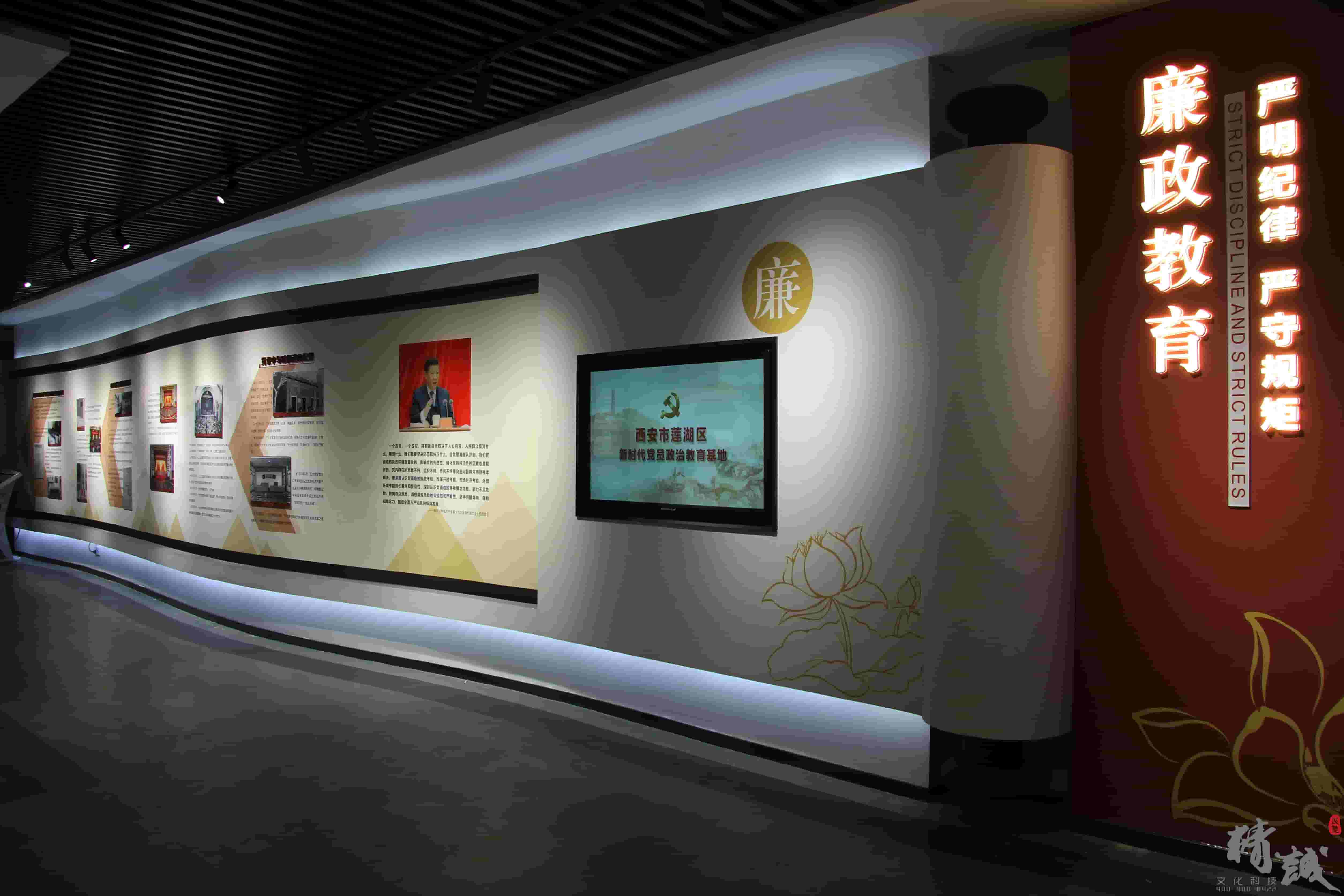以畫軸的展現形式展示習近平總書記全面從嚴治黨重要論述,將廉政建設的重要性和意義娓娓道來,液晶顯示屏播放廉政教育相關視頻,注重從嚴治黨的正面宣傳,加強黨員干部的廉政作風。