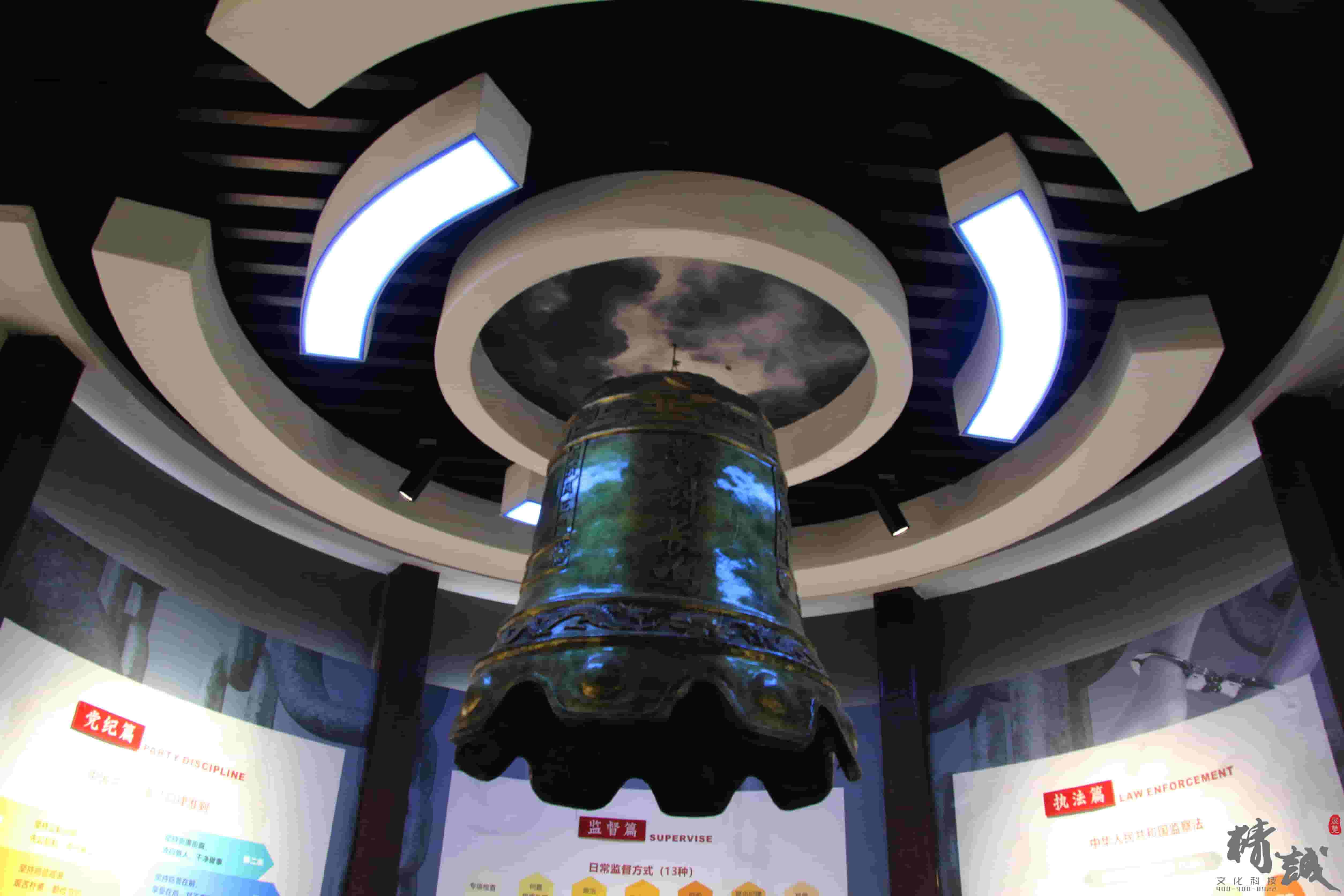 配合廉政警示教育,采用鐵絲網造型墻和吊頂警鐘設計,展示中央紀檢監察機構歷史沿革、蓮湖紀檢監察機構歷史沿革以及十八大以來中省市區反面典型案例,從視覺感官層面引導廣大黨員干部自警自省,自重自律。