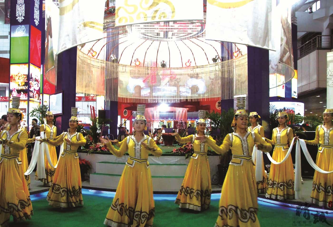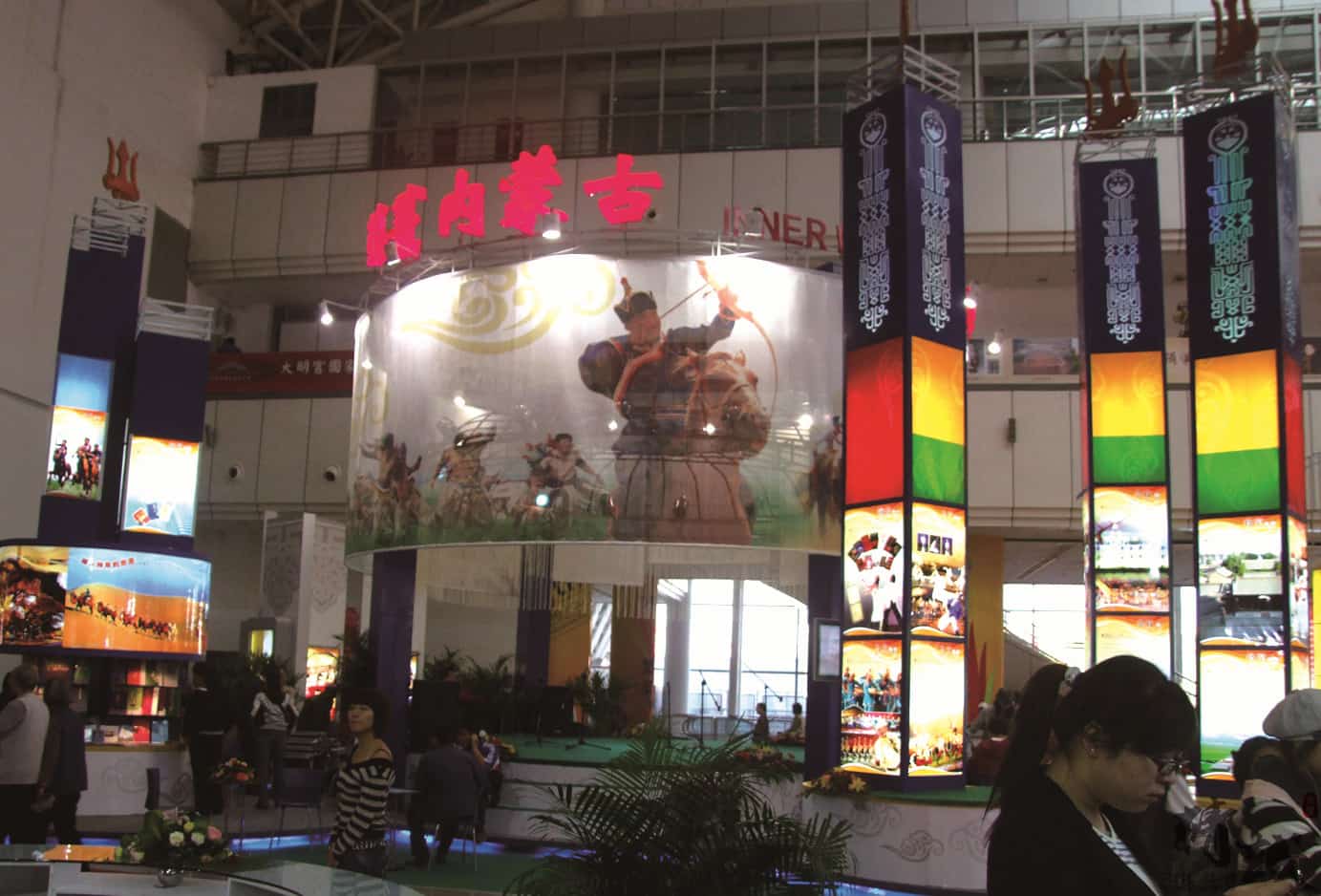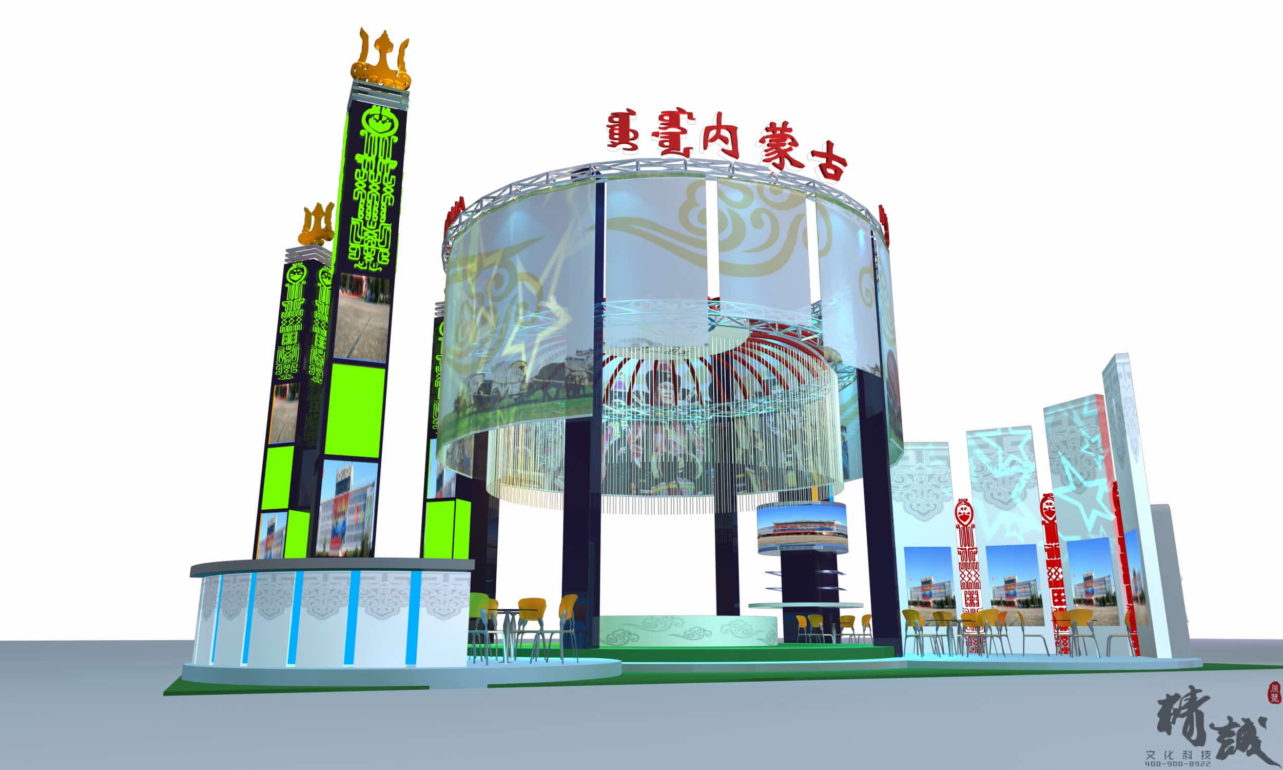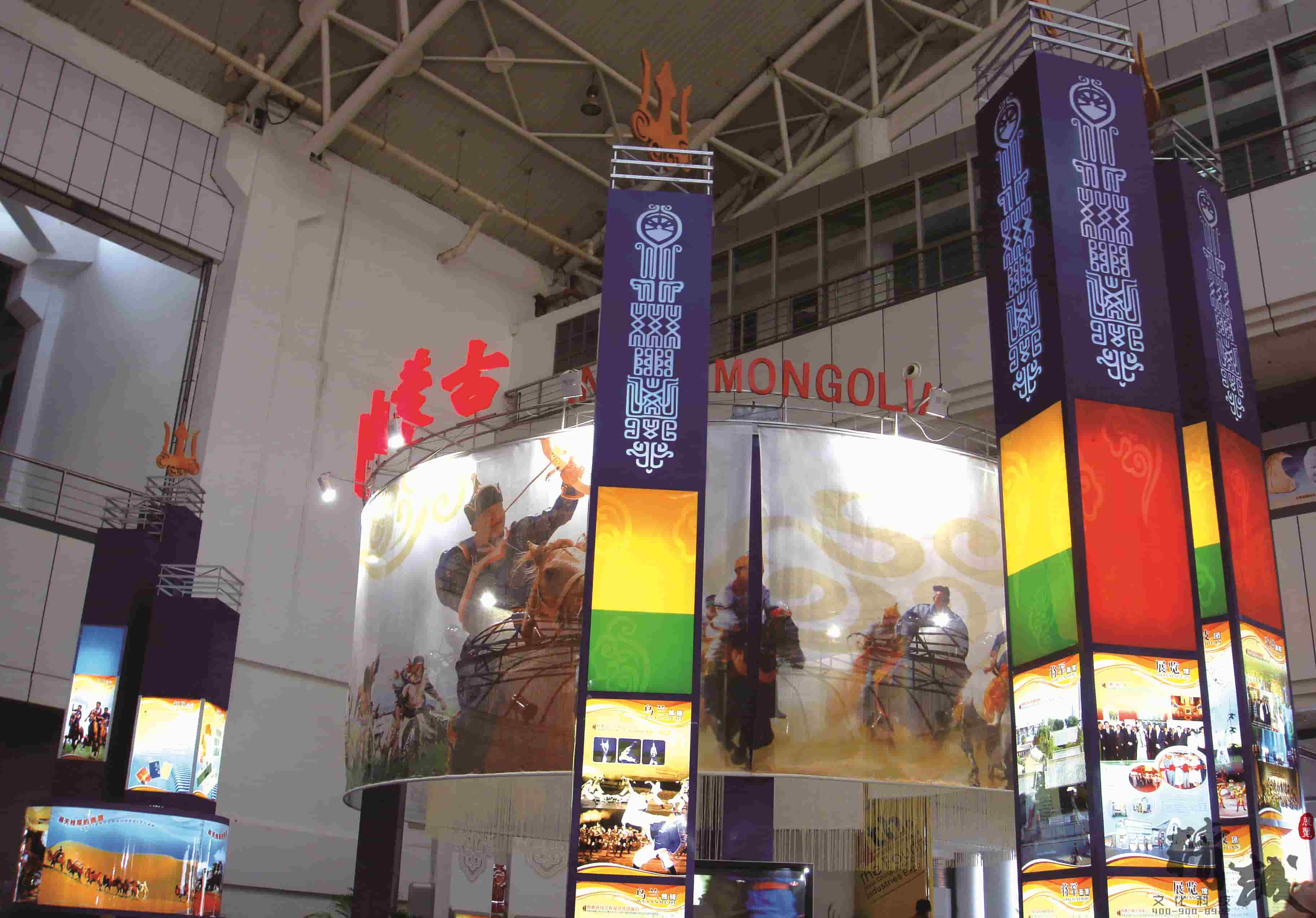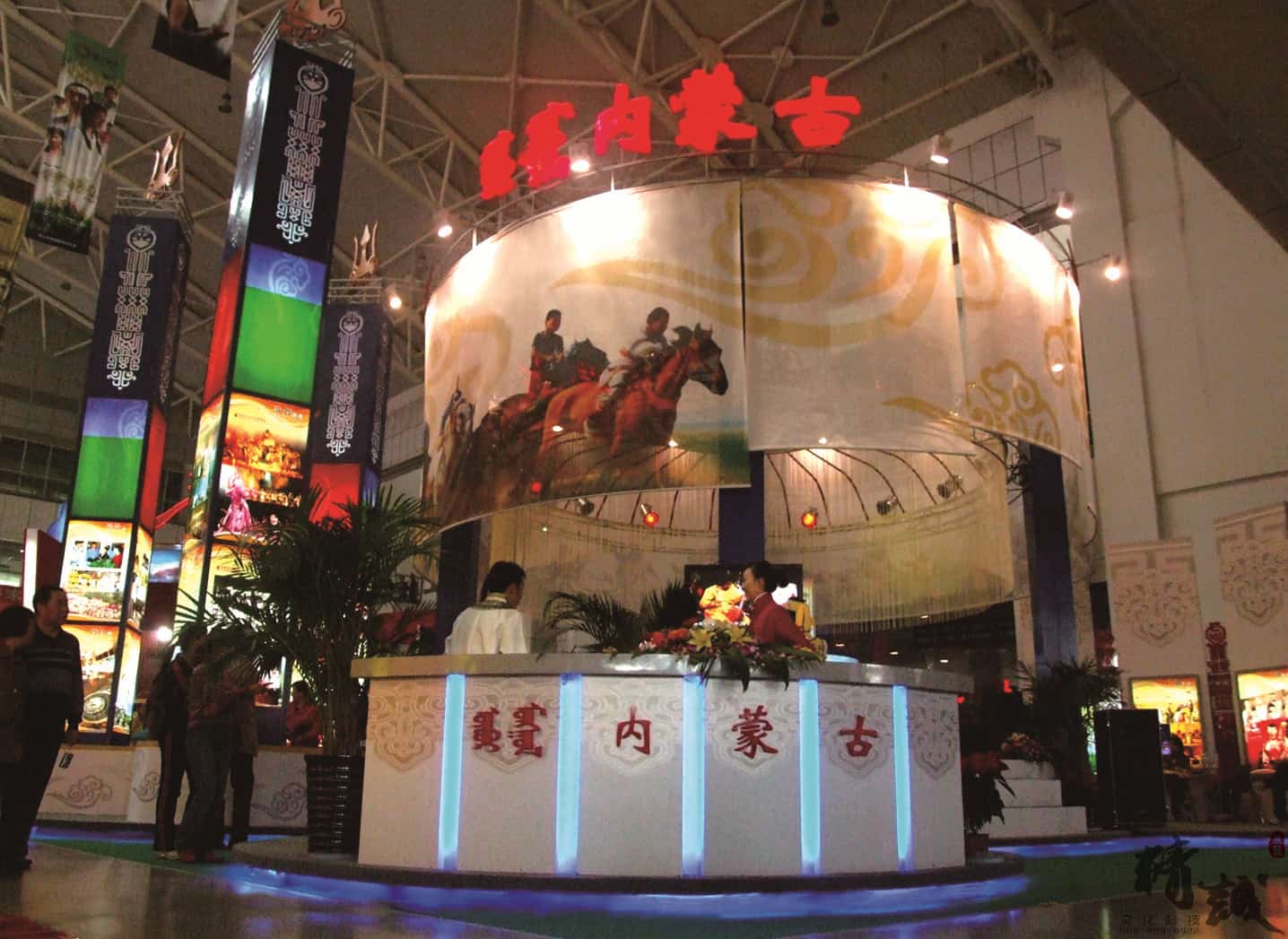 展位設計總體美觀大方,圖文并茂,富有民族特點,采用聲、光、電相結合的現代展示手法,做到“動態感”和“時代感”的完美結合。現場的載歌載舞的熱情氣氛,展示出了草原的文化和獨具北疆特色的旅游基地。