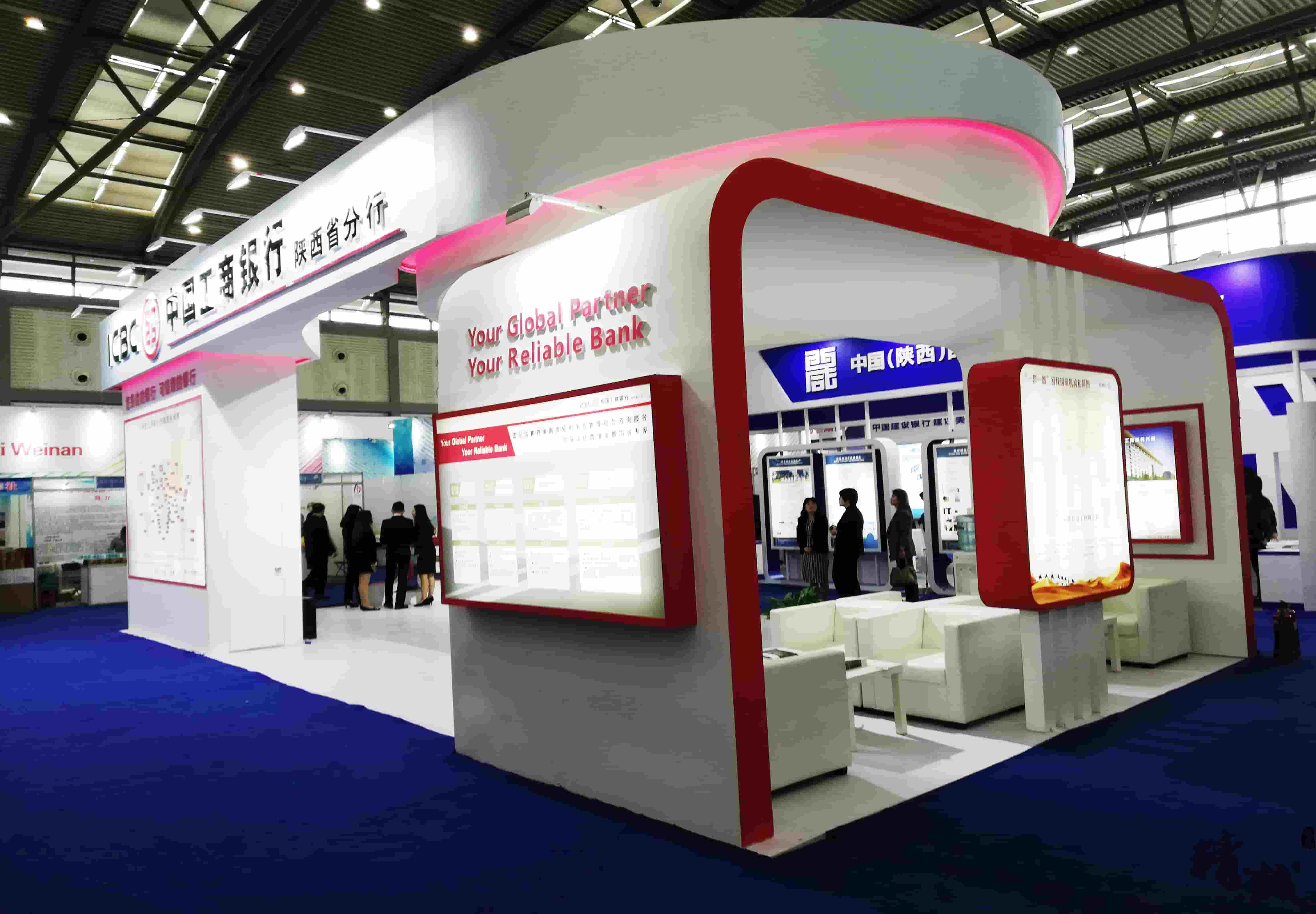 中國(guó)工商銀行展位采用開敞式的布局,能夠使參觀者在其中自由參觀;色彩上以白色為主,紅色作為點(diǎn)綴,運(yùn)用合理的燈光進(jìn)行搭配,營(yíng)造出干凈、簡(jiǎn)約的展陳氛圍。展區(qū)內(nèi)部采用聲、光、電相結(jié)合的現(xiàn)代展示手法,打造功能合理、展陳明確的展位形象。