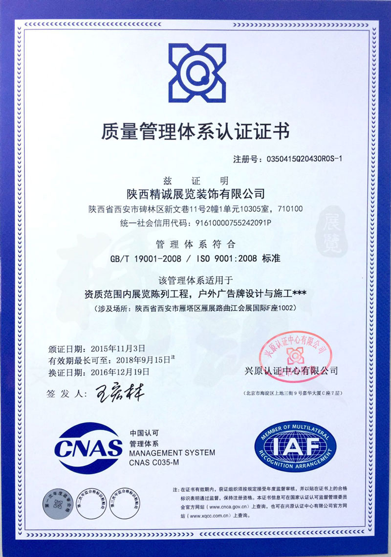 - 陜西精誠展覽裝飾有限公司質(zhì)量管理體系認(rèn)證證書 -